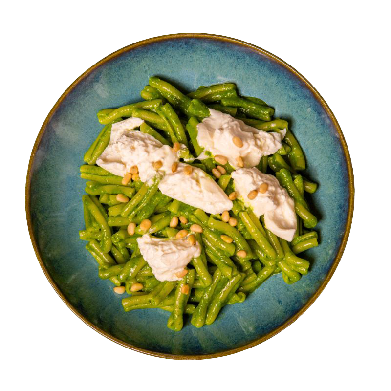 CASARECCE (PÂTES FRAÎCHES), SAUCE PESTO à LA GENOVESE MAISON, BURRATA ET PIGNONS GRILLéS